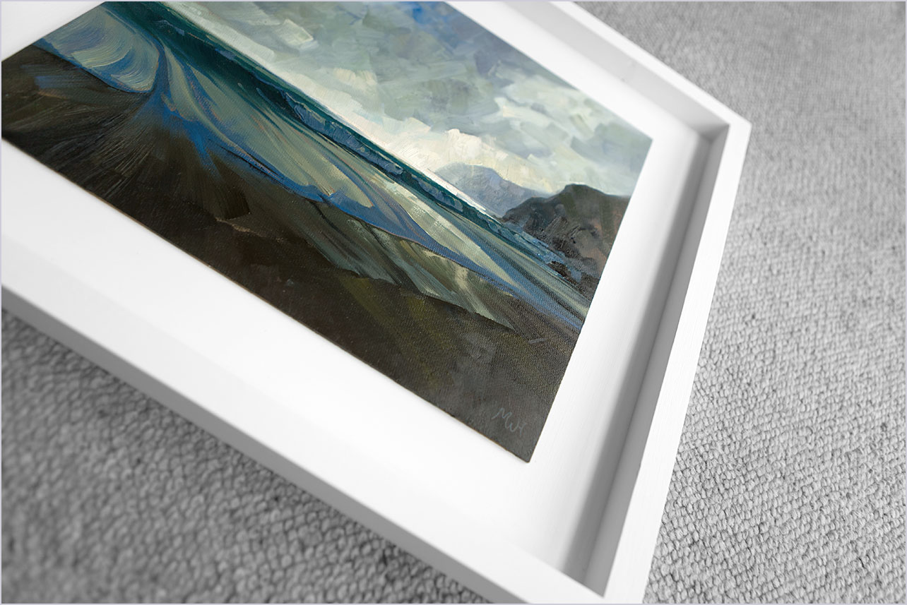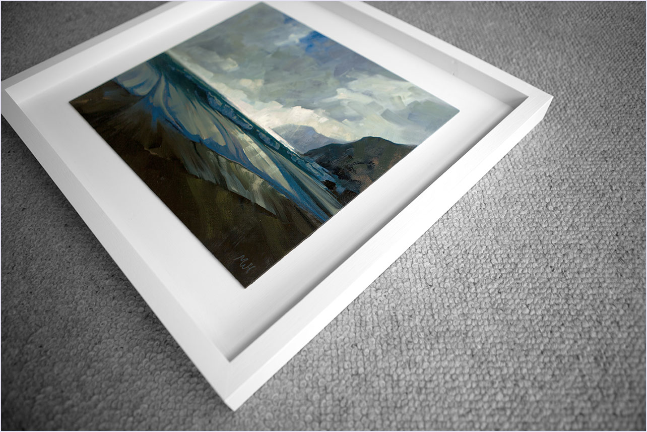 Framed original painting in oil. This painting is displayed in a box type frame with a chalky white finish without glass.