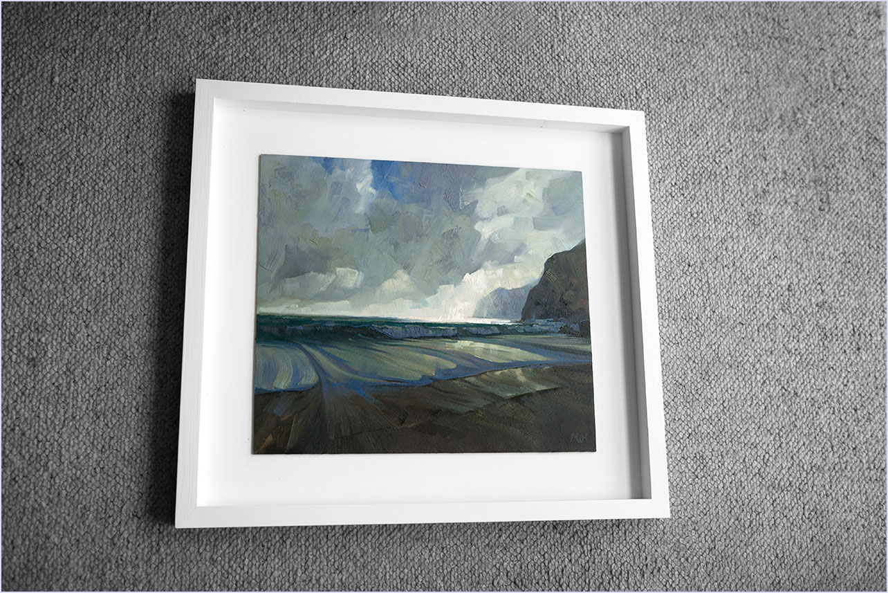 A murky mysterious beach on some imaginary stretch of coast. The sun appearing through a distant break as the blustery rain clears. Breakers pummel the shores endlessly.
