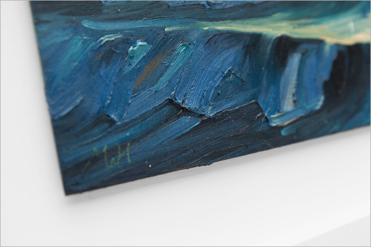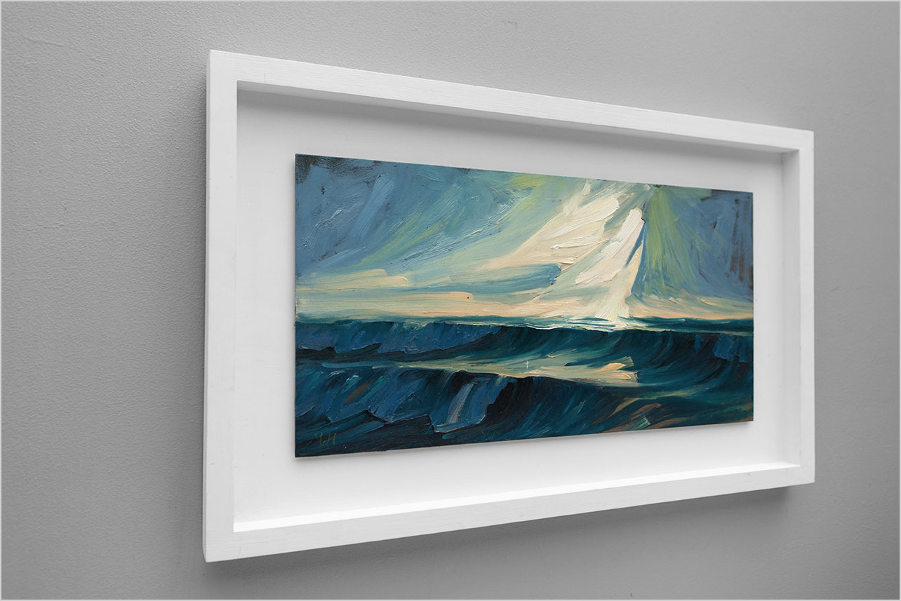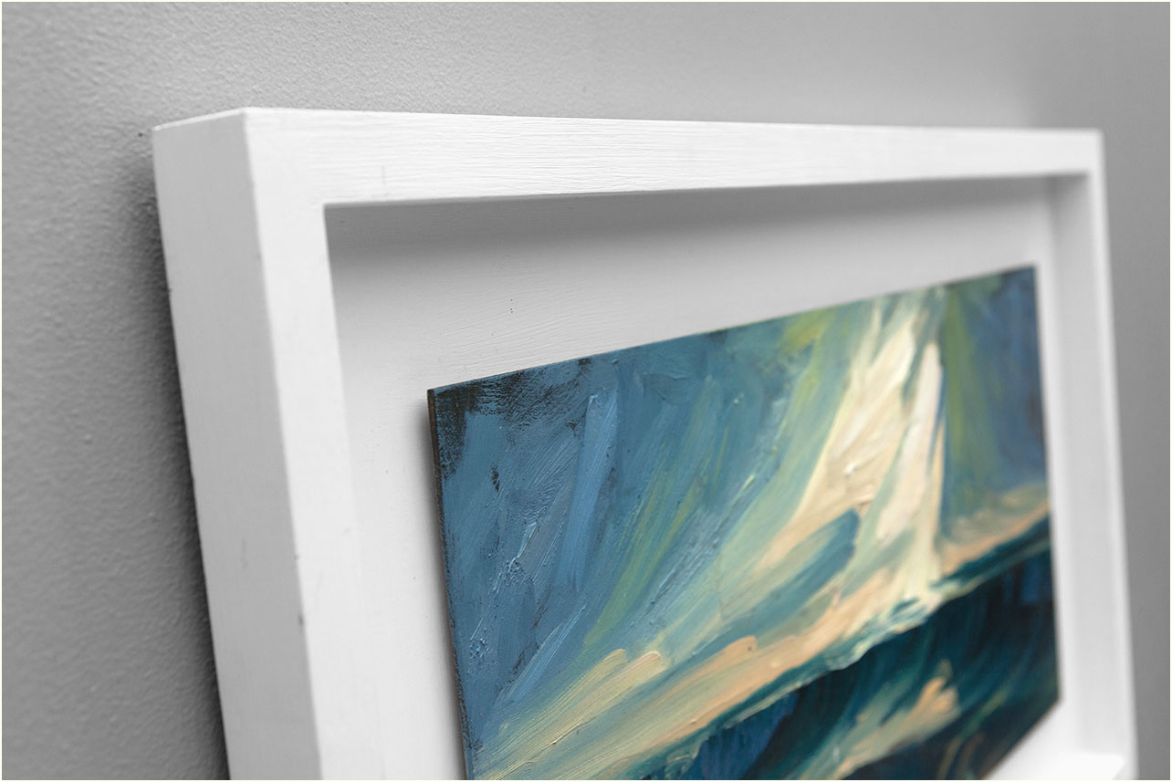 Framed original painting in oil. This painting is displayed in a chalky white box type frame without glass.