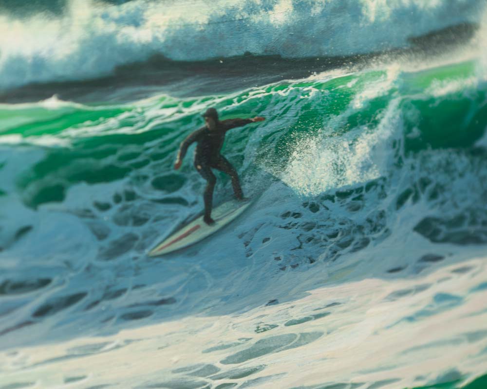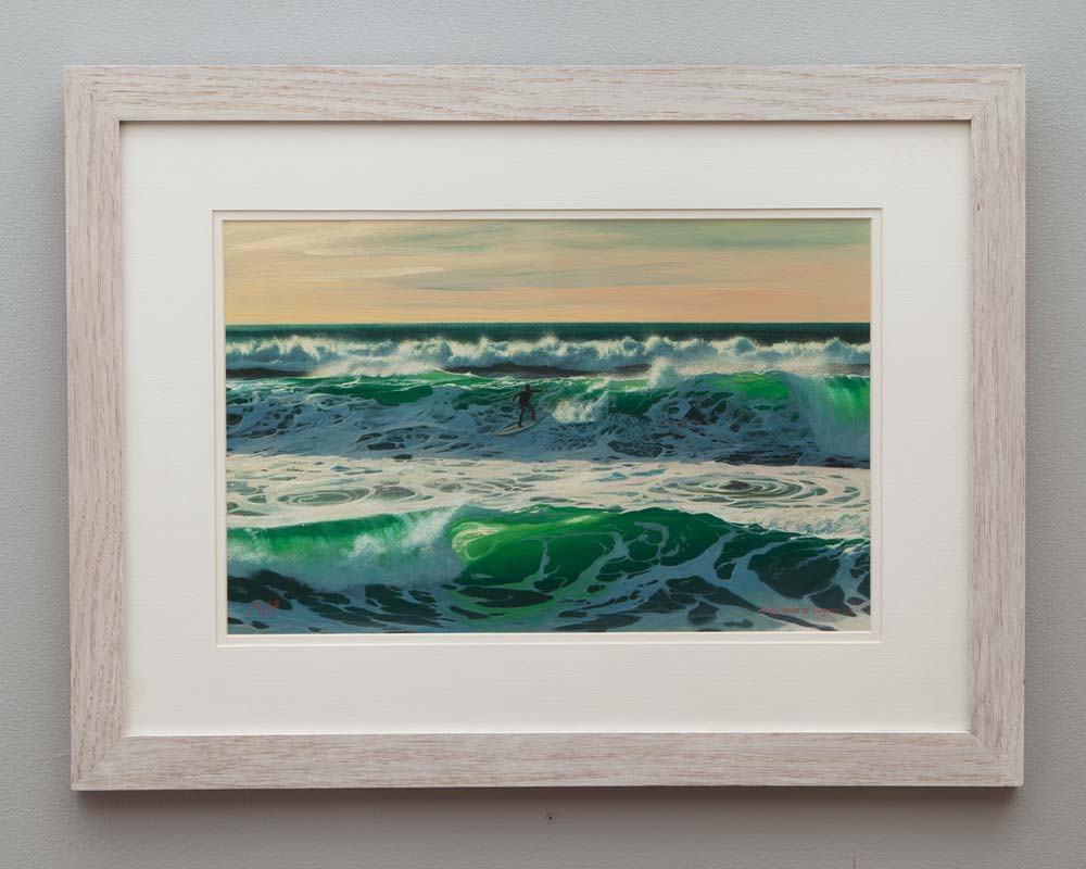 Framed original painting in gouache. A surfer at Sennen Cove on a winters day. This seascape is painted in gouache and comes in an oak frame with double mount and glass. Glazed.