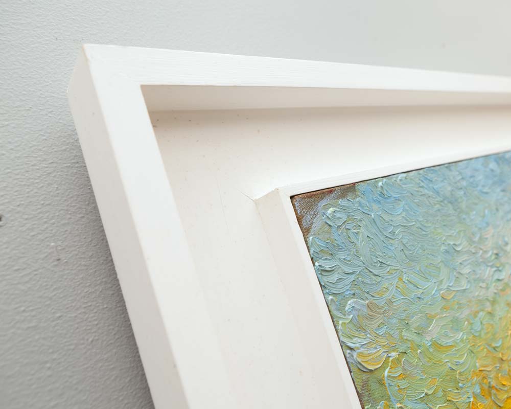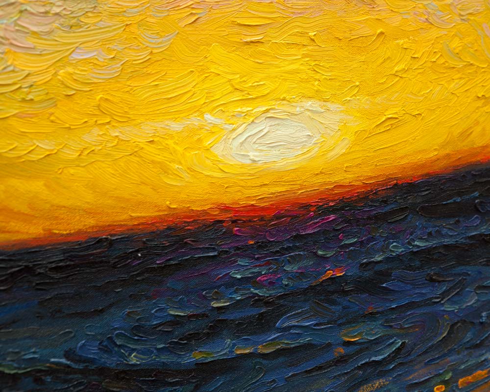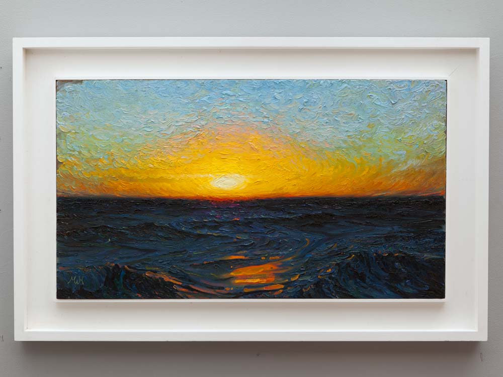 An impasto oil on canvas where one imagines being taken on a voyage somewhere at sea, sluicing along on a yacht perhaps, the only sound is the water gushing past. I wanted to study the intense banding of colours that occur as the sun sinks low. One of my larger pieces.