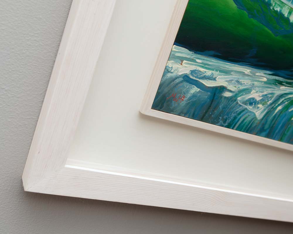 Framed original painting in gouache. It comes in a box type frame with a chalky white finish. Glazed.