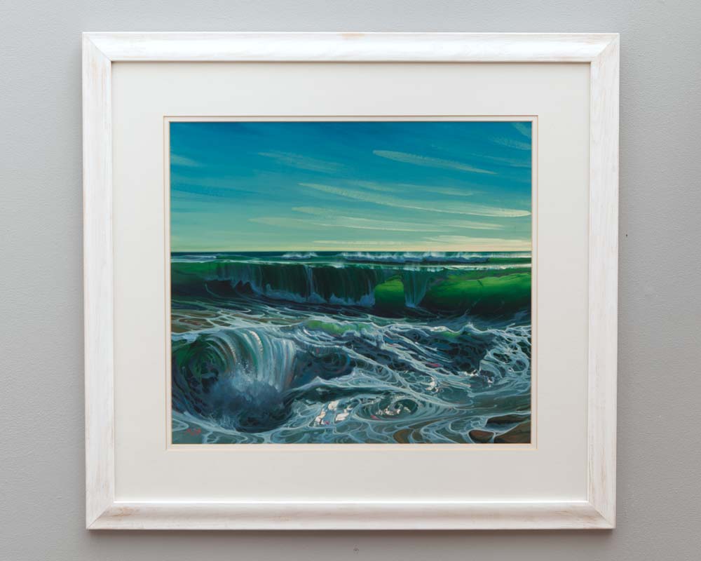 Framed original painting in gouache. This seascape comes in a whitewashed oak frame with double mount and glass.