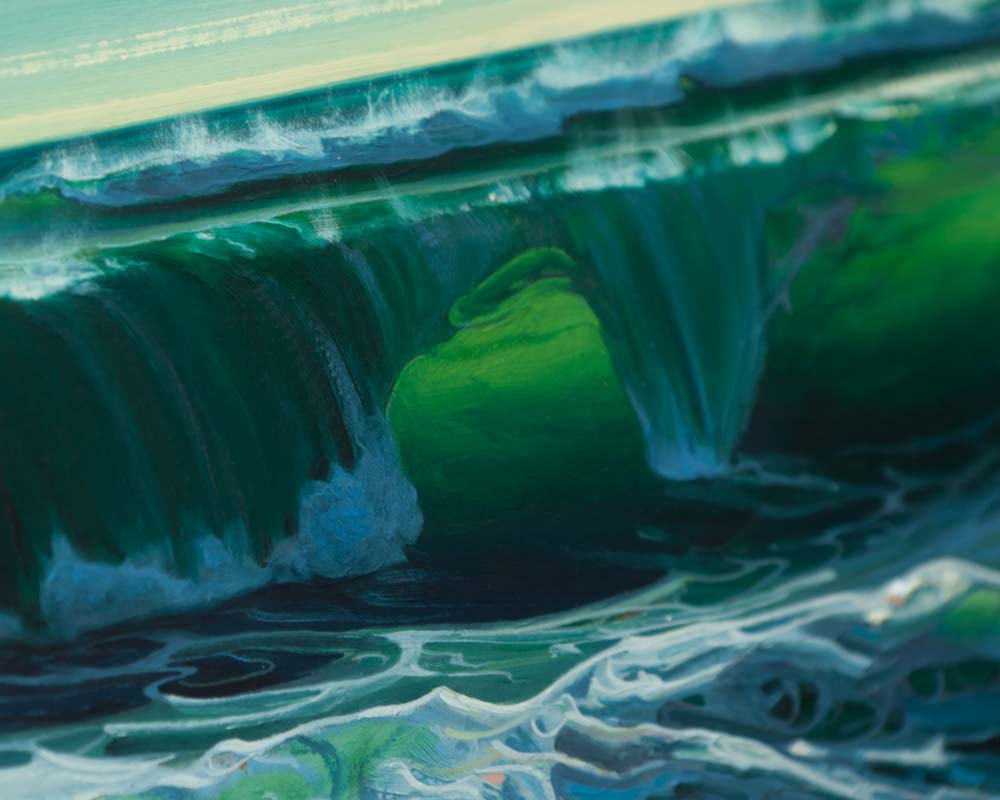 Depicting a gnarly green wave surging onto beach and catching the sparkle for a fleeting moment before exploding to whitewash.