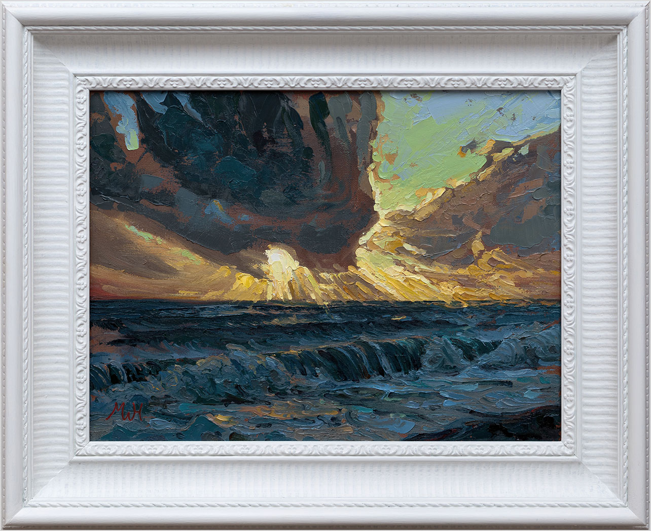 Framed original painting. It comes in an older style frame with a chalky white finish without glass.