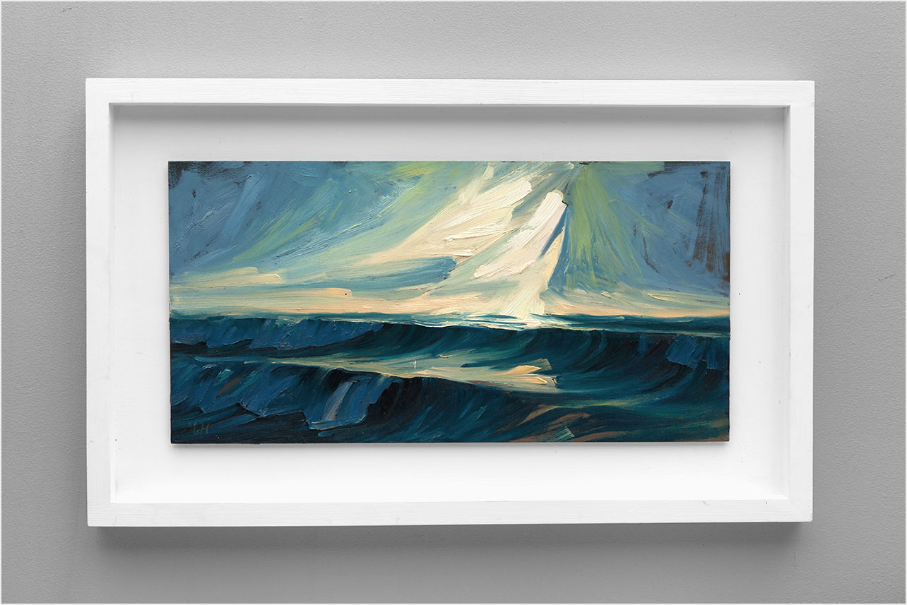 Framed original painting in oil. This painting is displayed in a chalky white box type frame without glass.